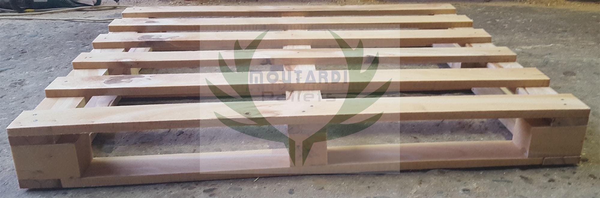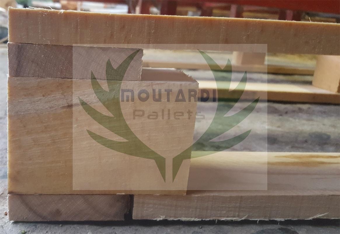 Dans d’autres cas cependant (notamment lorsque des pièces métalliques lourdes sont posées sur les palettes) le poids porté sur ces palettes peut atteindre voire dépasser les deux tonnes, et la palette reçoit alors une configuration plus robuste, avec au moins 7 planches sur le dessus pouvant avoir l’épaisseur jusqu’à 22 mm..